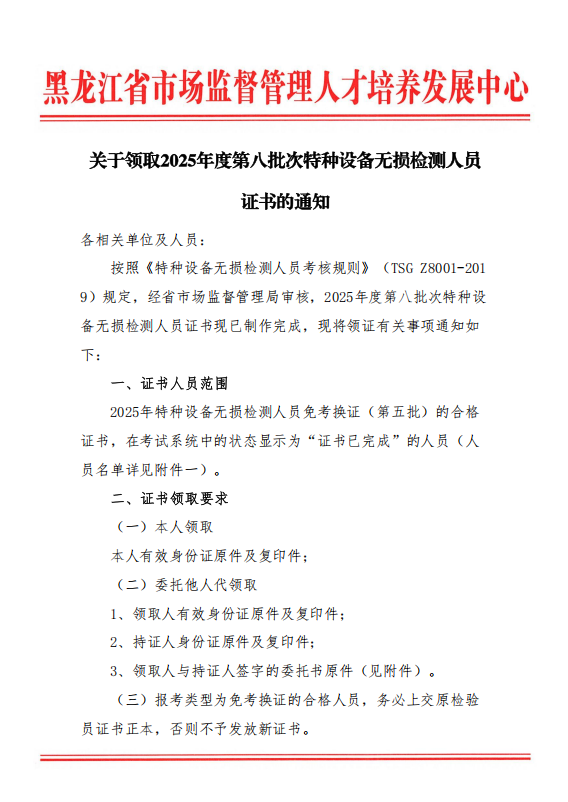 关于领取2025年度第八批次特种设备无损检测人员证书的通知
