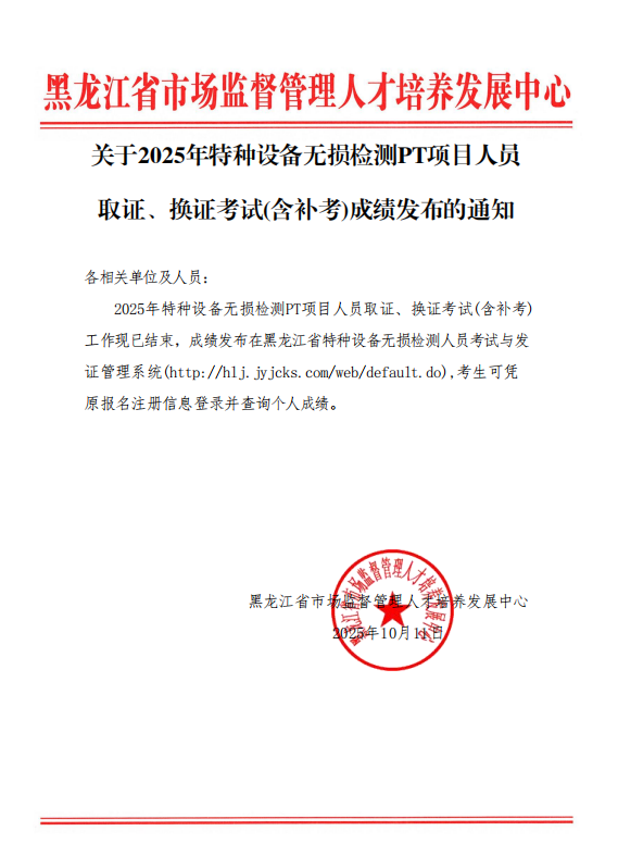 关于2025年特种设备无损检测PT项目人员取证、换证考试(含补考)成绩发布的通知