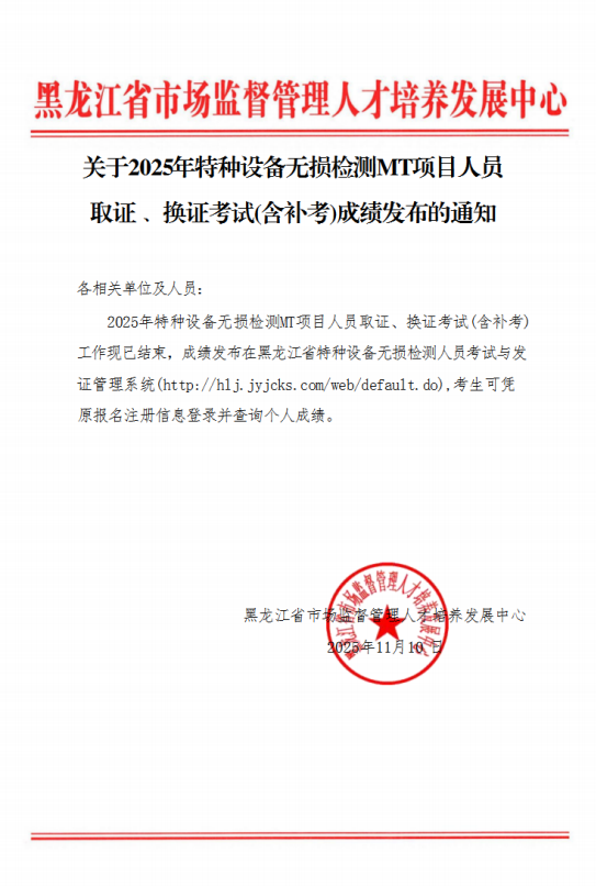关于2025年特种设备无损检测MT项目人员取证、换证考试(含补考)成绩发布的通知