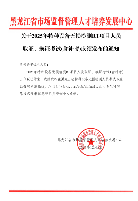 关于2025年特种设备无损检测RT项目人员取证、换证考试(含补考)成绩发布的通知