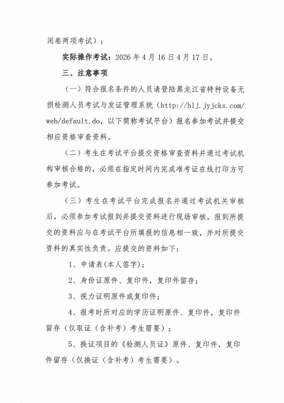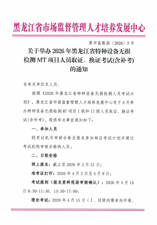 关于举办2026年黑龙江省特种设备无损检测MT项目人员取证、换证考试(含补考)的通知